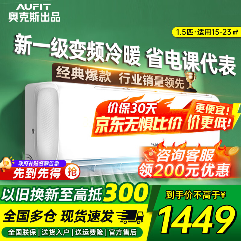 AUFIT空调奥克斯出品大1.5匹P挂机一级能效家用变频冷暖壁挂节能省电防直吹大风量官方正品以旧换新补贴 大1.5匹 一级能效挂机冷暖变频丨基础款