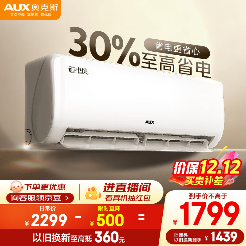奥克斯(AUX)空调 省电侠 大1.5匹 新一级能效变频 节能防直吹空调挂机 国家补贴 KFR-35GW/BpR3AQS1(B1)
