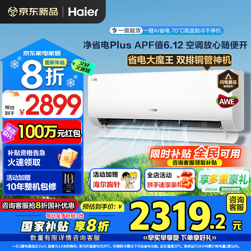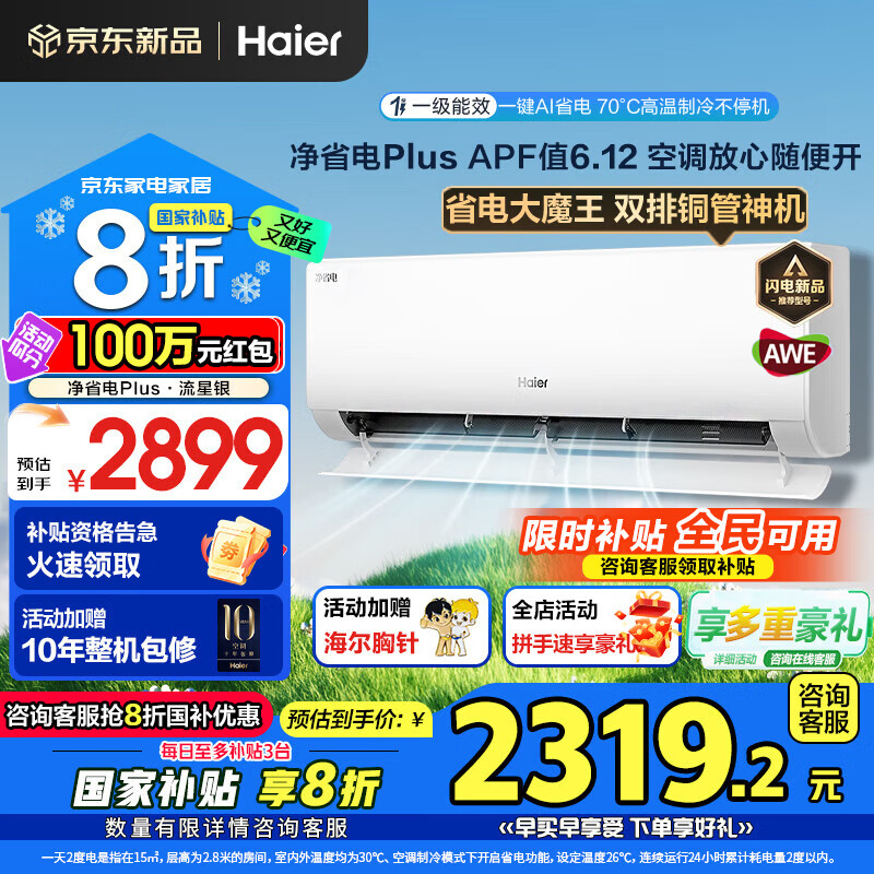 海尔(Haier)空调净省电Plus1.5匹强劲冷暖新一级能效节能变频家用挂机壁挂式一键AI省电除菌 全屋智联独立除湿 1.5匹 一级能效 一天两度电+大风口一键AI省电