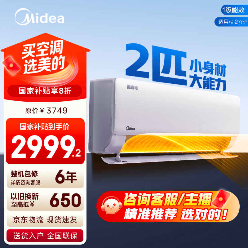 美的(Midea)空调2匹挂机 酷省电 新一级能效 卧室壁挂家用独立除湿节能省电智能家电以旧换新 2匹 一级能效 【两匹挂机】省电28%