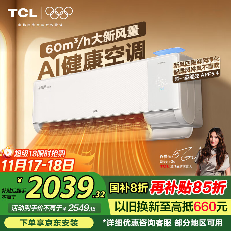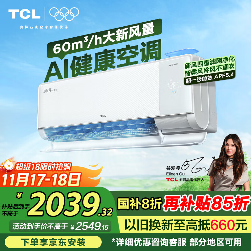 TCL京东联名 1.5匹新风空调小蓝翼Q7ProAI健康空调新一级挂机变频KFR-35GW/YQ7Ea+B1以旧换新国家补贴