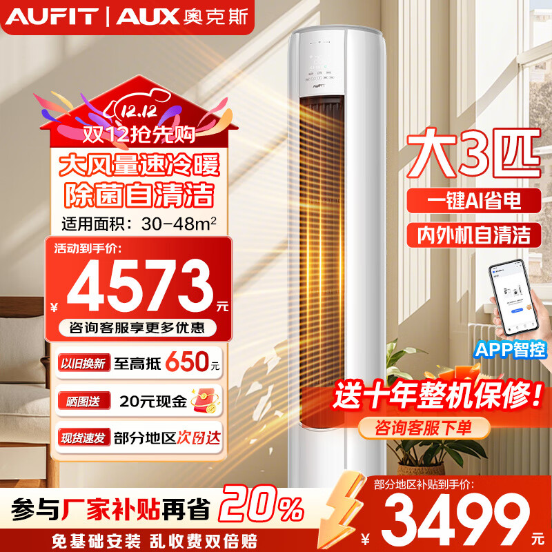 AUFIT空调奥克斯(AUX)出品大3匹柜机新一级变频冷暖自清洁家用客厅大标间大风量立柜式国补20%空调 3匹 一级能效【25年新品】防直吹AFQA1(B1)