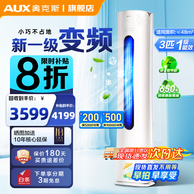 奥克斯(AUX)空调大3匹柜机新一级能效奥精灵家用冷暖省电节能静音升级立式客厅空调神机自清洁厂家补贴20% 大3匹 奥精灵 一级能效变频