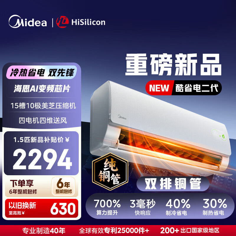 美的(Midea)酷省电 爆款推荐 空调挂机 大1.5匹新一级能效全直流变频节能低噪音防直吹 以旧换新 国家补贴 酷省电 大1.5匹 二代制热省电30% 26年新款