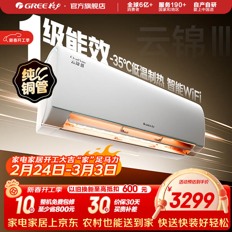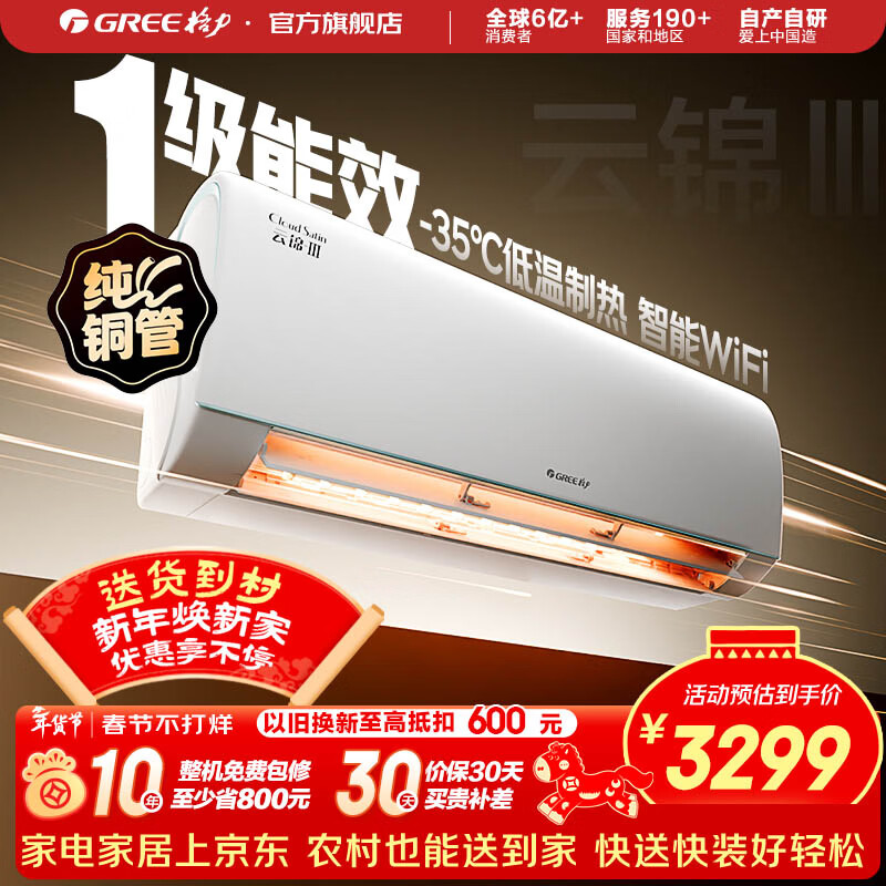 格力(GREE)空调 云锦三代 新一级能效 变频冷暖 自清洁 智能WIFI 壁挂式空调挂机 家电国家补贴 以旧换新 云锦III 新一级能效冷酷款 1.5匹