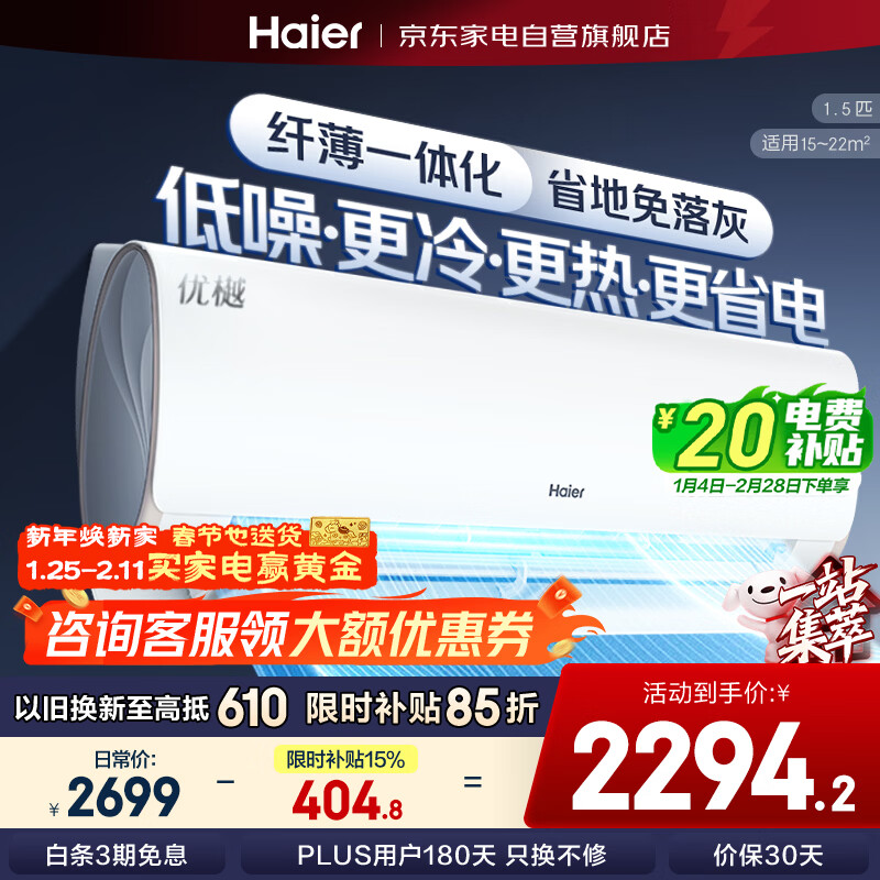 海尔空调1.5匹一级能效家用挂机壁挂式3匹统帅1/2匹P卧室冷暖变频