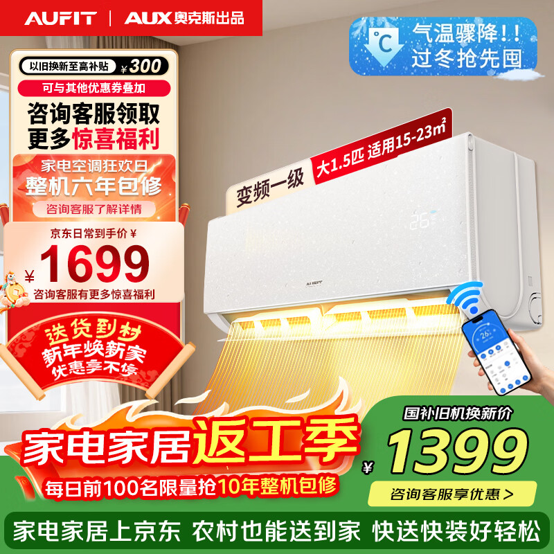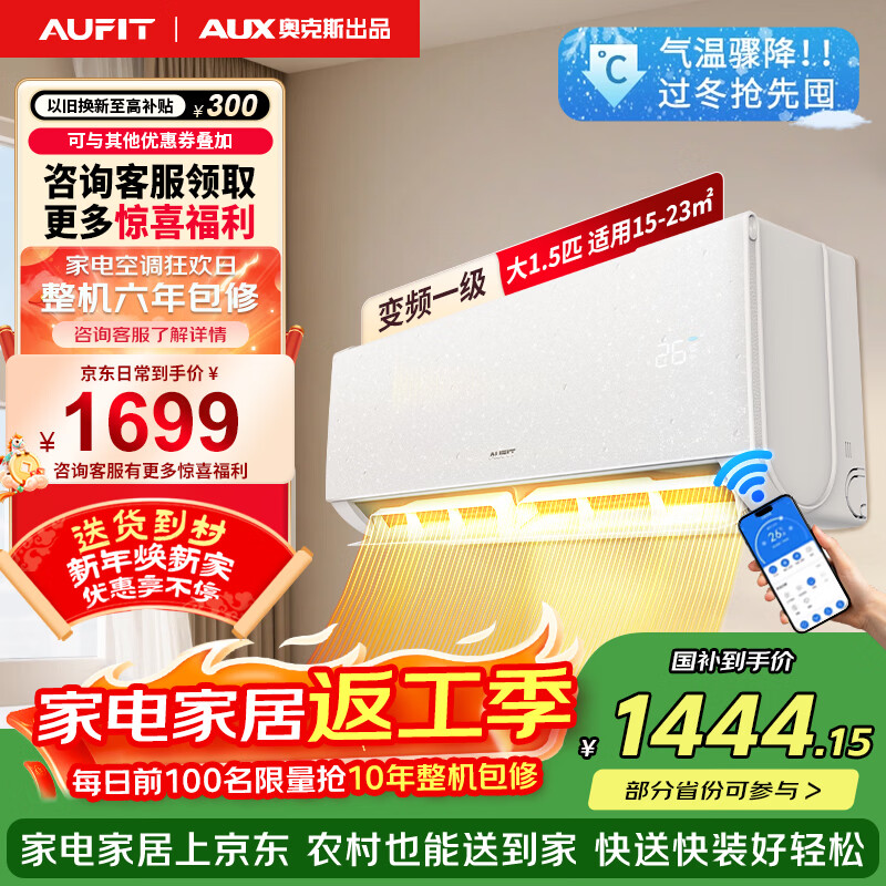 AUFIT空调奥克斯(AUX)出品大1匹/1.5匹wifi智控新一级能效挂机全直流变频冷暖除菌省电壁挂式自清洁空调 大1.5匹wifi智控一级能效(15-23㎡) 【奥克斯出品】一级挂省电24%