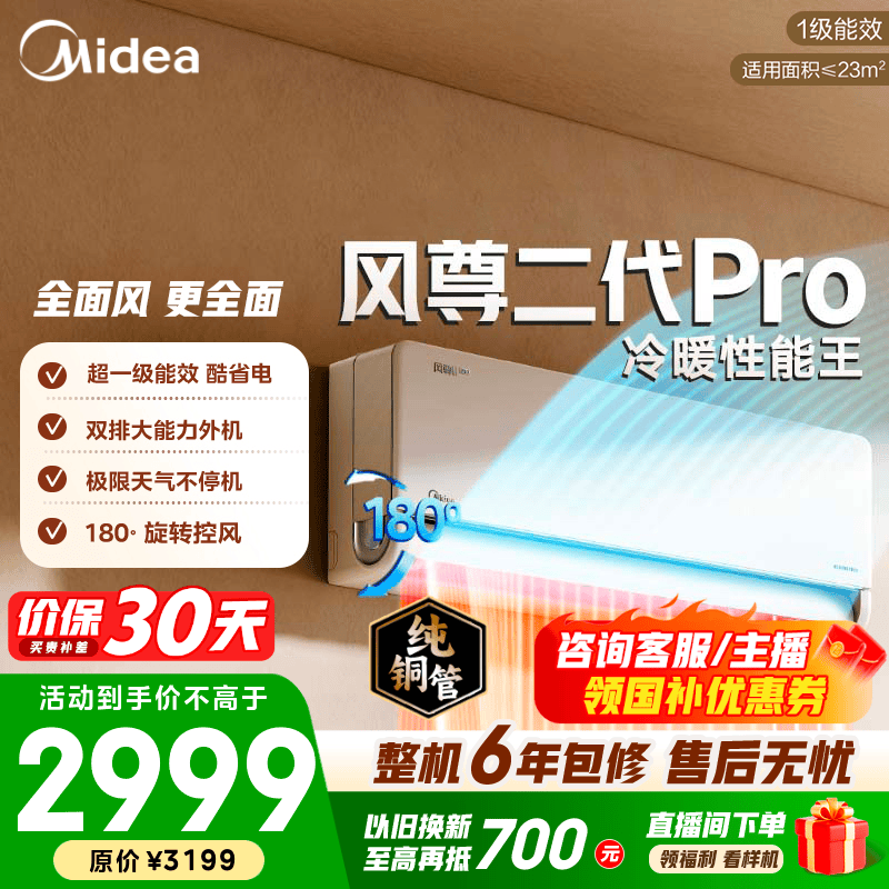 美的空调 大1匹/1.5匹 风尊三代 超一级能效变频冷暖 全面风 四季空调 卧室空调挂机 国家补贴 风尊二代Pro 大1.5匹 双排外机制热