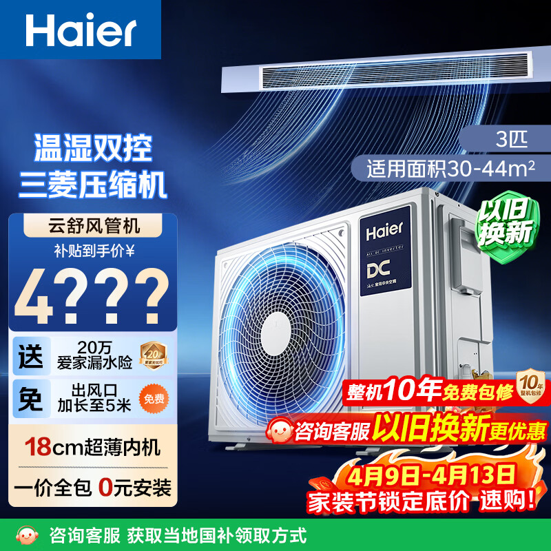 海尔中央空调云舒风管机一拖一客厅 3匹一级能效 纯铜管 云璟pro升级款 KFRd-72NW/72ECD81 国家补贴