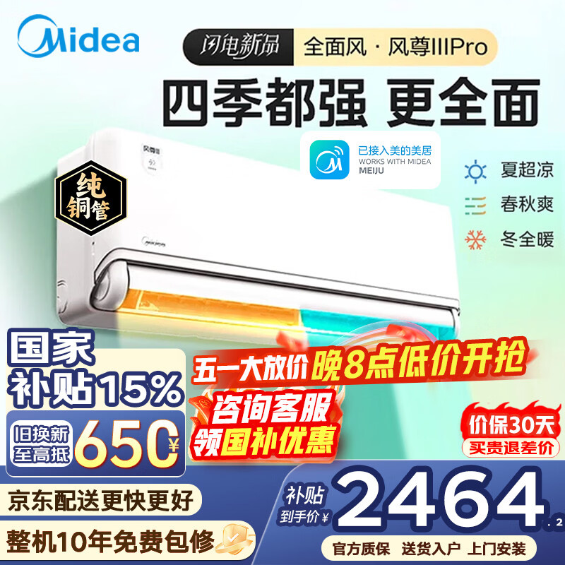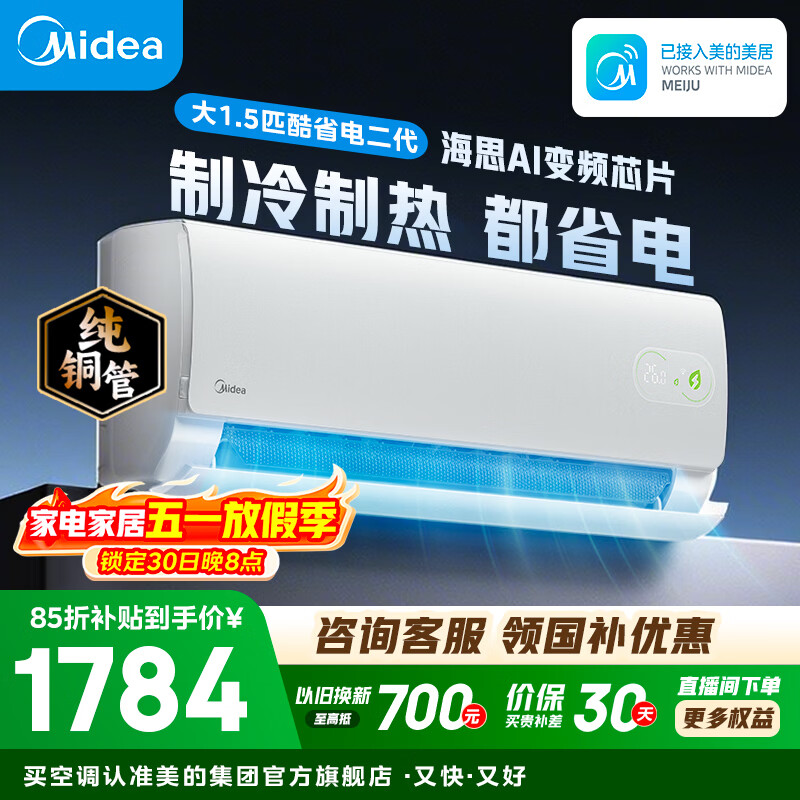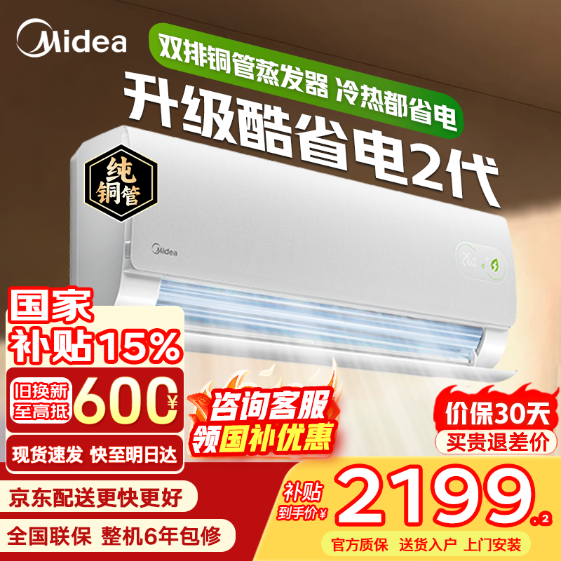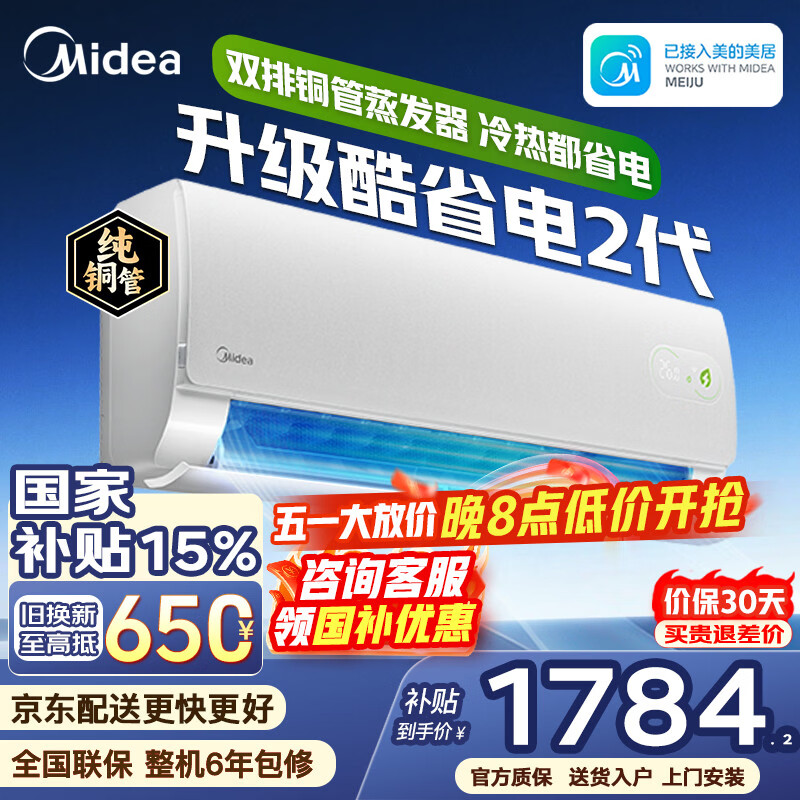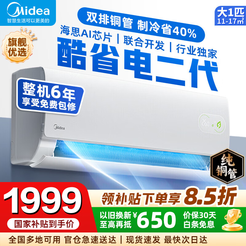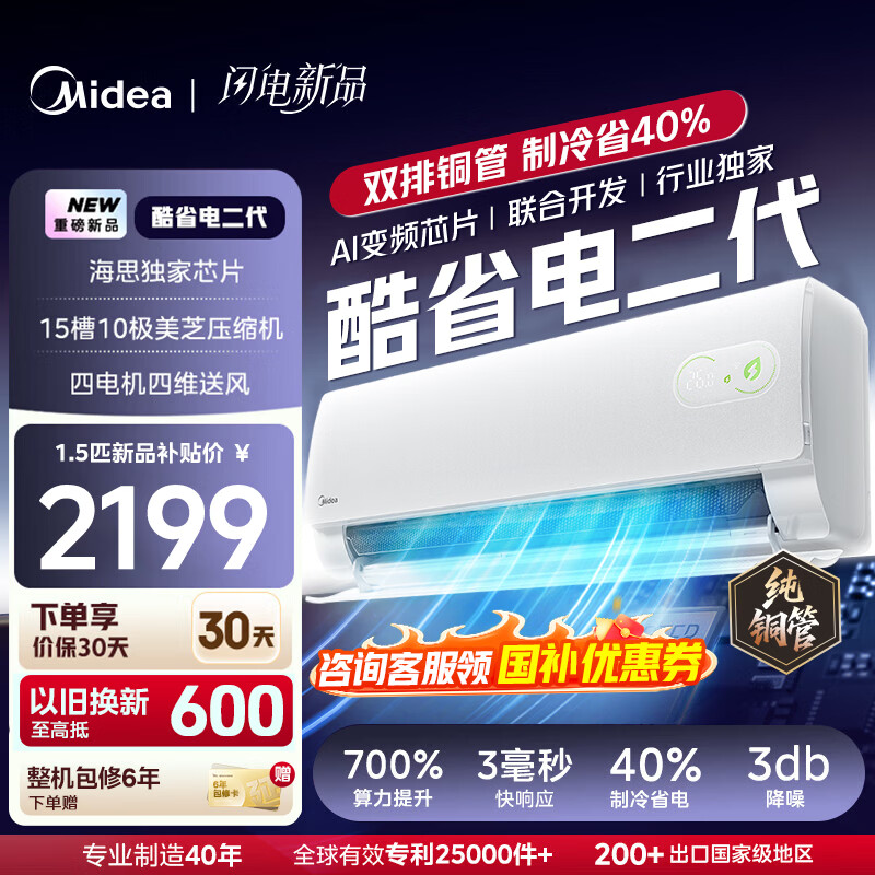 美的(Midea)空调大1.5匹挂机酷省电二代Pro新一级能效变频节能冷暖两用壁挂式卧室空调防直吹低噪WiFi智控补贴 酷省电二代 大1.5匹 海思AI变频芯片 冷热都省电