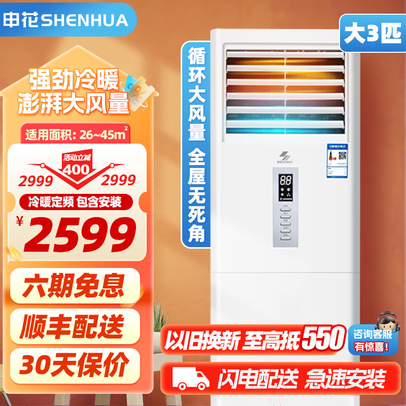 申花(SHENHUA) 大3匹 空调补贴 立式柜机 落地式 家用空调圆柱柜机 节能省电 急速冷暖 以旧换新 大风量客厅除湿 巨瀑风 大3匹 冷暖柜机 含安装 六年联保丨顺丰入户