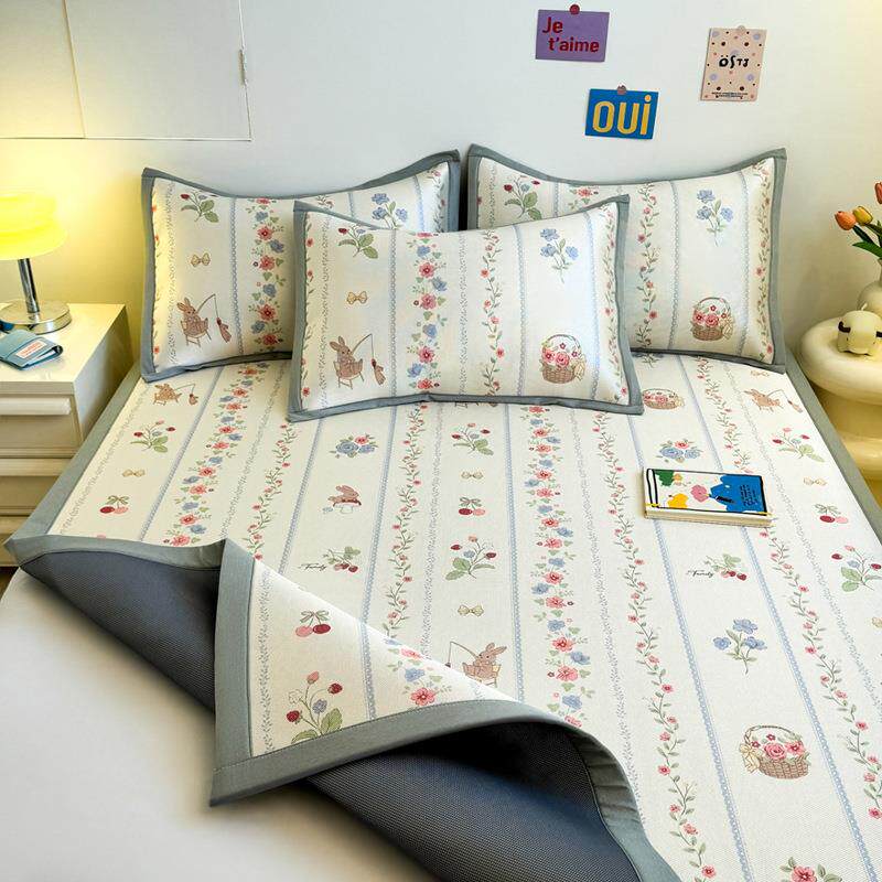 田园风夏天冰藤席2025新款冰丝凉席三件套儿童床单空调席软席