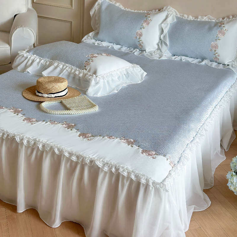 夏季凉感a类冰丝凉席三件套可机洗公主风蕾丝刺绣床裙空调软席子