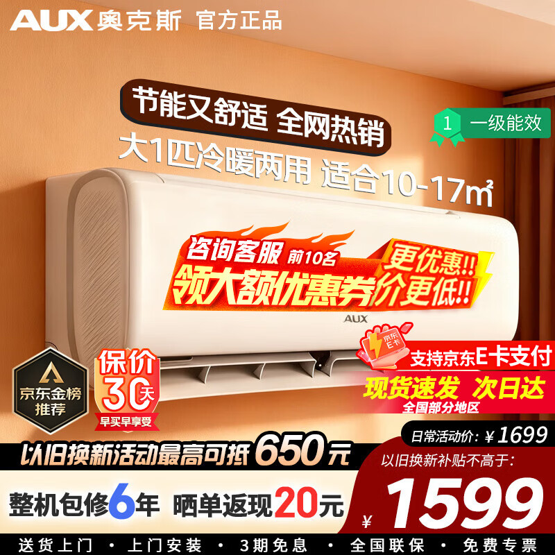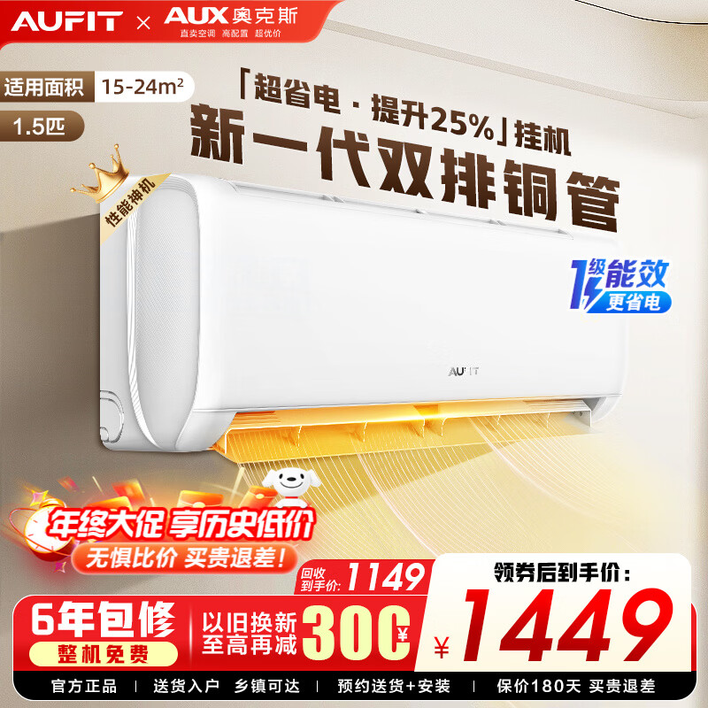 AUFIT空调奥克斯(AUX)出品空调挂机1.5匹/1匹/2匹家用新一级变频冷暖省电WIFI自清洁以旧换新家电补贴 大1.5匹 一级能效【基础款】新一级变频