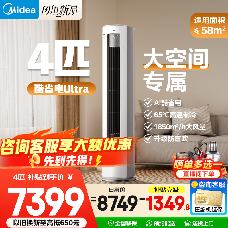 美的(Midea)空调4匹 酷省电Ultra 省电神机 新一级能效变频冷暖 大客厅空调立式柜机16米远距离送风 4匹 一级能效新品酷省电ultra