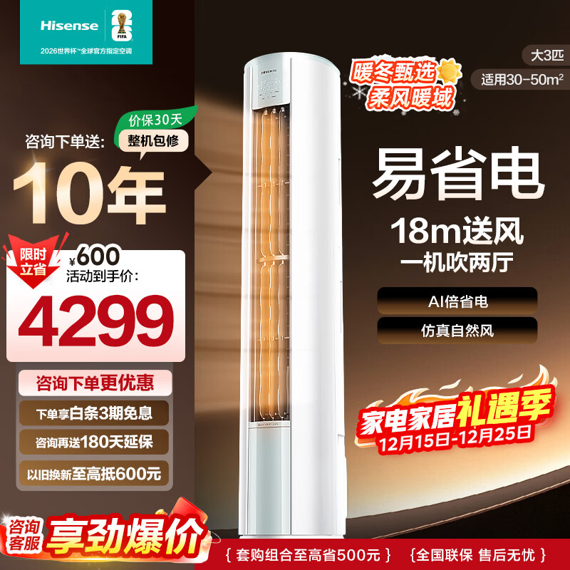 海信(Hisense)大3匹空调新品柜机【咨询领券更低】新一级 节能省电1810m³/h大风量 18m送风 APP智控柜机E290X1A 大3匹 一级能效 【客厅首选 新品爆款】E290X1A