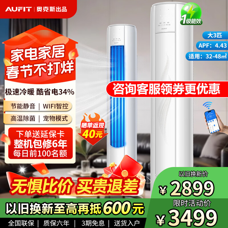 AUFIT空调奥克斯(AUX)出品 大1匹 新一级能效 变频悬挂式空调智能WIFI控制急速冷暖控温壁挂机 超省电 大3匹 一级能效 带WiFi冷暖【柜机】