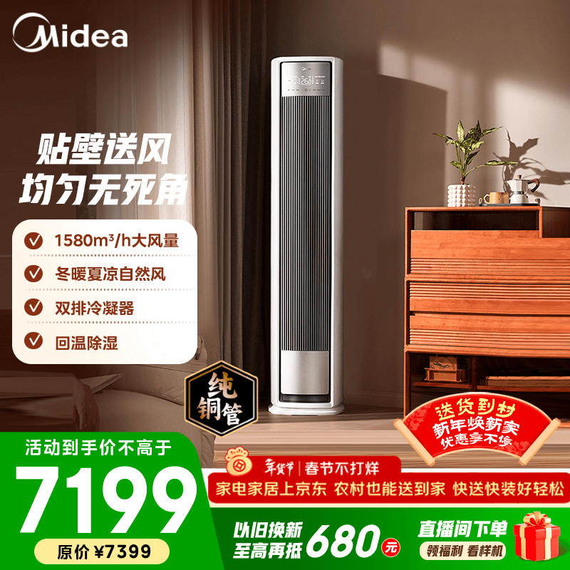 美的空调 2匹/3匹 全面风 新一级能效变频冷暖 贴壁送风 防直吹 客厅立式柜机 国家补贴 以旧换新 全面风 大3匹 双排冷凝 贴壁送风