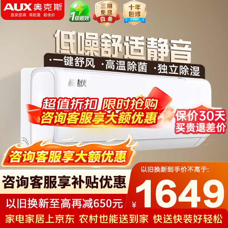 奥克斯(AUX)1.5匹新一级能效空调挂机 变频冷暖壁挂式空调 自清洁一键防直吹 节能省电卧室空调挂机以旧换新 1.5匹一级能效极速侠节能静音省电适用15-20㎡