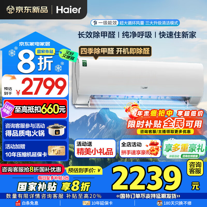 海尔空调1.5匹除醛净省电强劲冷暖新一级能效节能变频家用空调挂机 壁挂式全屋智联净化空气大风量除菌 1.5匹 一级能效除甲醛+净化空气+净省电除菌除湿