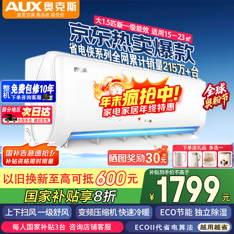 奥克斯【家电补贴20%】大1.5匹/大1P新一级能效省电侠新品挂机空调变频冷暖 大风量壁挂式家用卧室防自吹 省电侠 大1.5匹 新一级能效 ECO省电30% 国家补贴