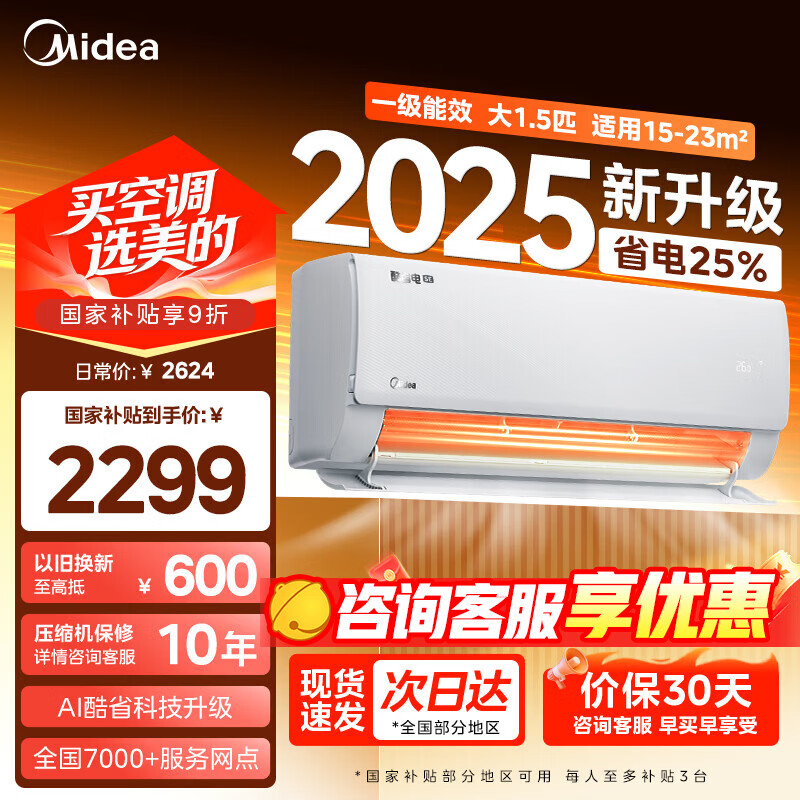 美的(Midea)空调挂机美的酷省电pro大1.5匹新一级能效1匹变频冷暖家用卧室壁挂式静音以旧换新 大1.5匹 一级能效 酷省电2025版升级款