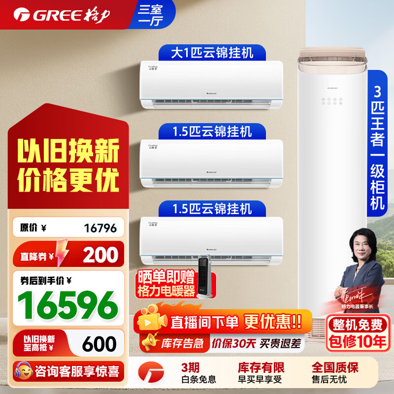 格力(GREE)新一级能效 高温自清洁 家用节能省电 云锦挂机+王者柜机空调多种组合 挂机柜机空调套装 【三室一厅】云锦1匹+云锦1.5匹*2+王者3匹