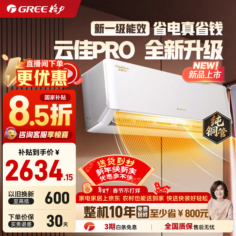 格力(GREE)空调云佳/云炫/云佳pro新一级能效【超级省电】家用节能 变频冷暖壁挂式卧室空调挂机56℃高温自洁 1匹一级能效云佳PRO