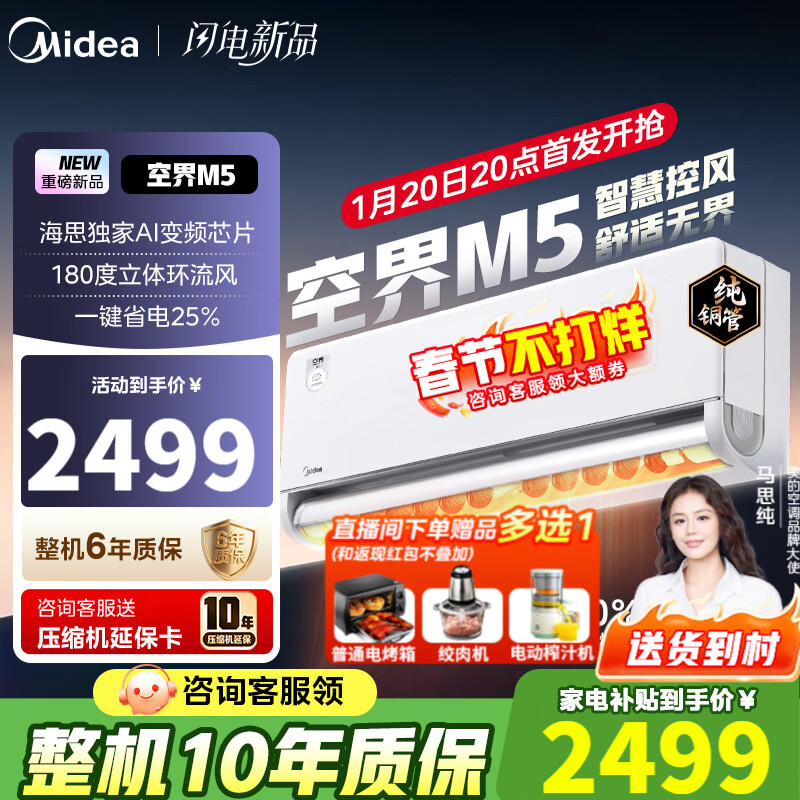 美的(Midea)空调空界M5风尊二代pro大1.5匹新一级能效变频冷暖全面风180°环游风纯铜管家用卧室壁挂式挂机 空界M5 大1.5匹 【鸿蒙互联26年新品】