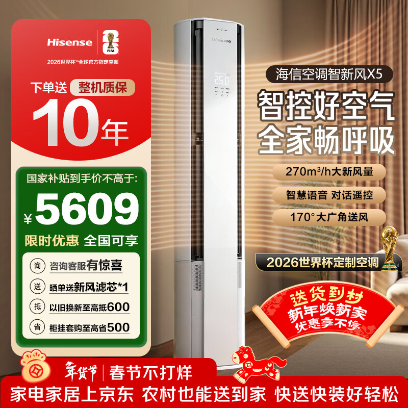 海信(Hisense)空调智新风X5 世界杯定制空调大3匹 补贴15% 大新风量 语音智控 以旧换新大客厅立式空调柜机 智新风 大3匹 【X5】AI智慧语音 增氧大新风