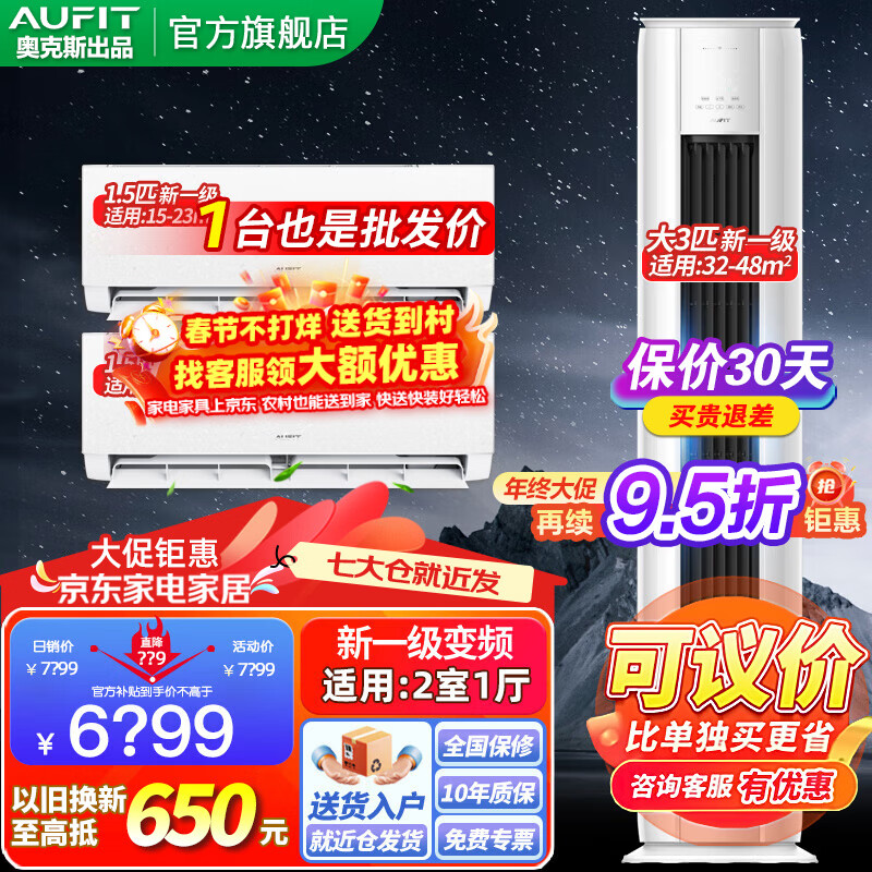 AUFIT空调奥克斯(AUX)出品【超值新一级空调套装】1/1.5/2/3匹变频冷暖 卧室挂机客厅柜机空调立式套装 (两室一厅wifi款)大3匹柜+2台大1.5匹挂