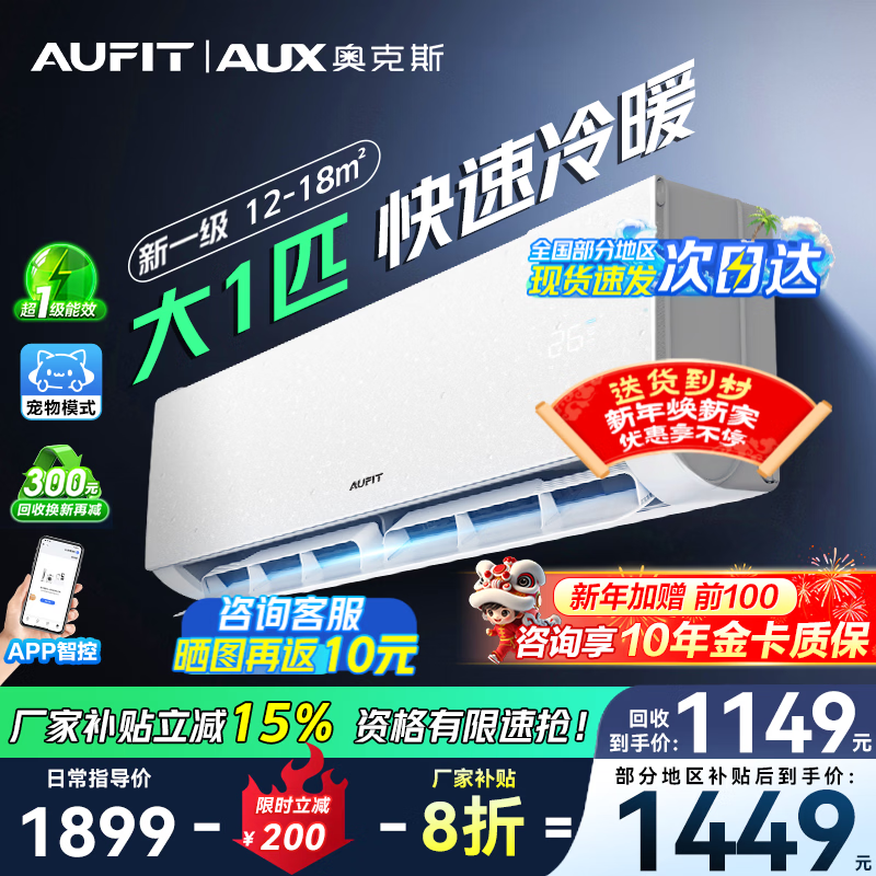 AUFIT空调奥克斯(AUX)出品挂机大1.5匹新一级能效变频冷暖家用卧室壁挂式防直吹除菌自清洁国补15%空调 大1匹 一级能效省电除菌自清洁宠物模式