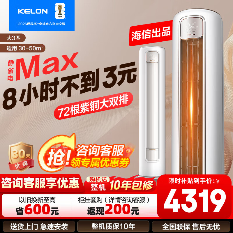 科龙(KELON)静省电Max 大3匹柜机 海信出品 空调立柜式 新一级能效变频速冷热防直吹家用客厅国家补贴以旧换新 静省电 大3匹 1级能效顶配MAX【咨询享底价】