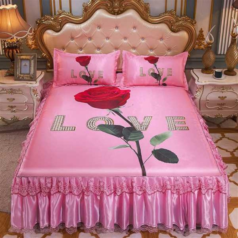 夏季床裙款冰丝凉席可机洗折叠夏B天蕾丝花边床罩空调软席子三件