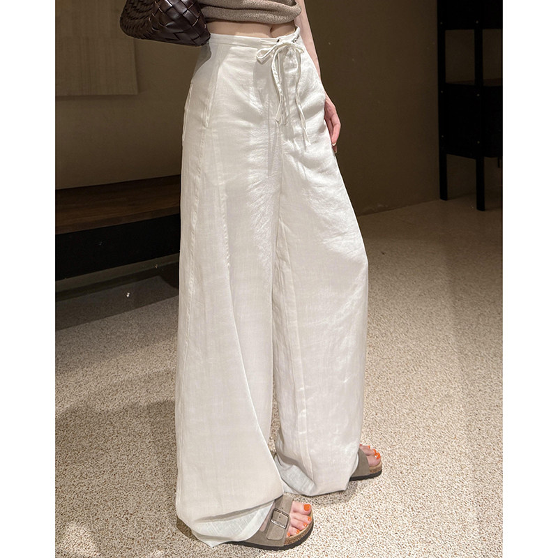 老钱风白色亚麻高腰绑带直筒阔腿裤女春季棉麻垂感休闲遛弯空调裤