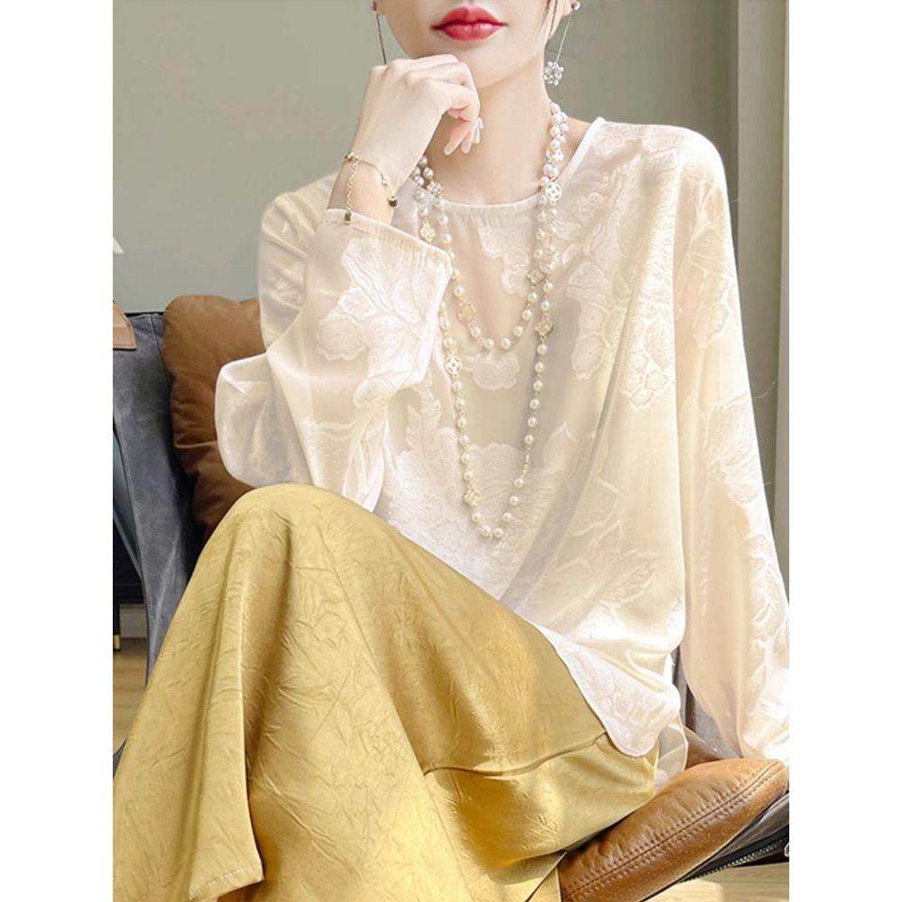 YENR新中式国风暗纹绣花圆领长袖上衣女外搭套头长袖空调衫防晒衫