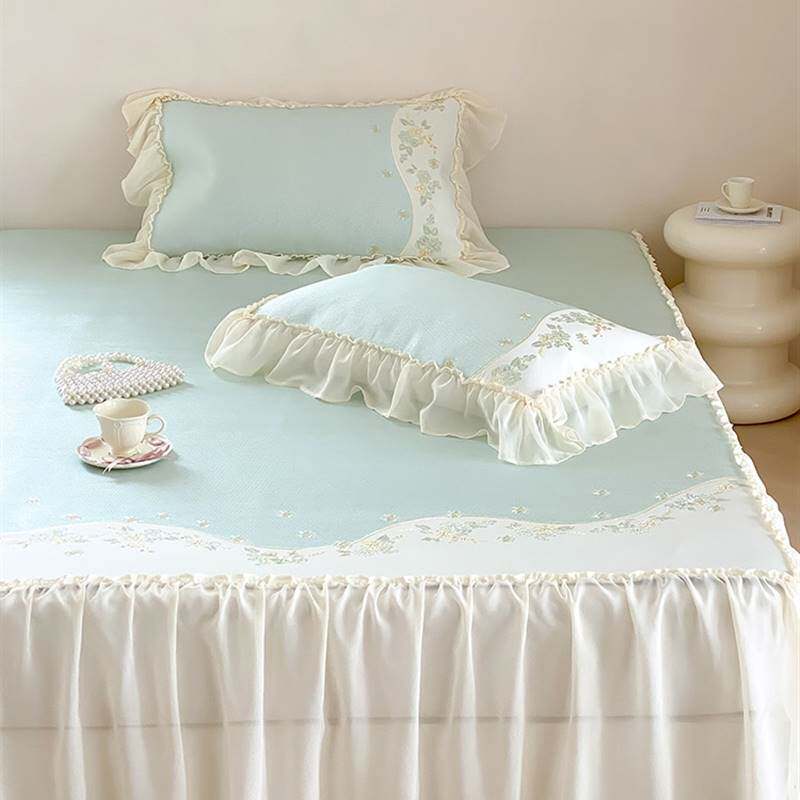夏季公主款凉感冰丝凉席三件套刺绣花边可水洗折叠1.8m空调软席