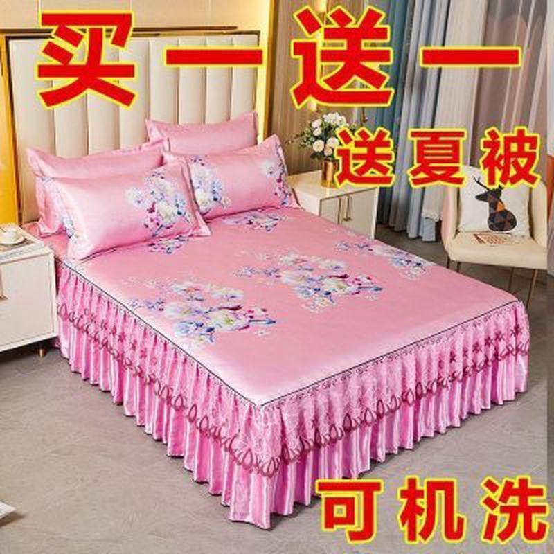 新款夏季可水洗冰丝凉席床裙款三件套蕾丝花边空调软席床罩式折叠
