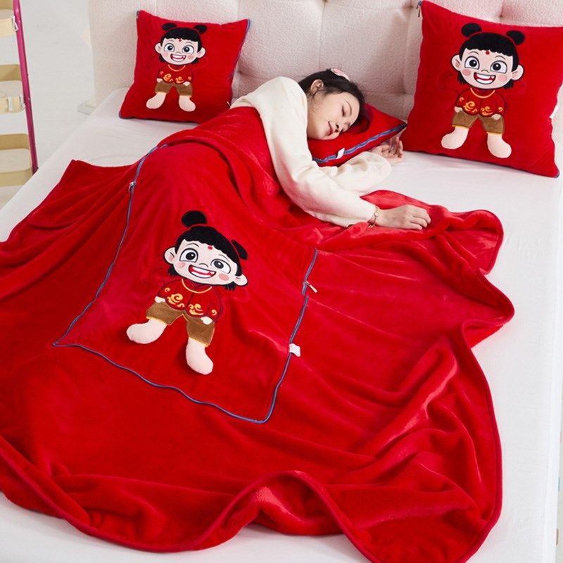 哪吒抱枕被两用h毛毯加厚加绒车载靠垫办公室沙发午睡可折叠空调