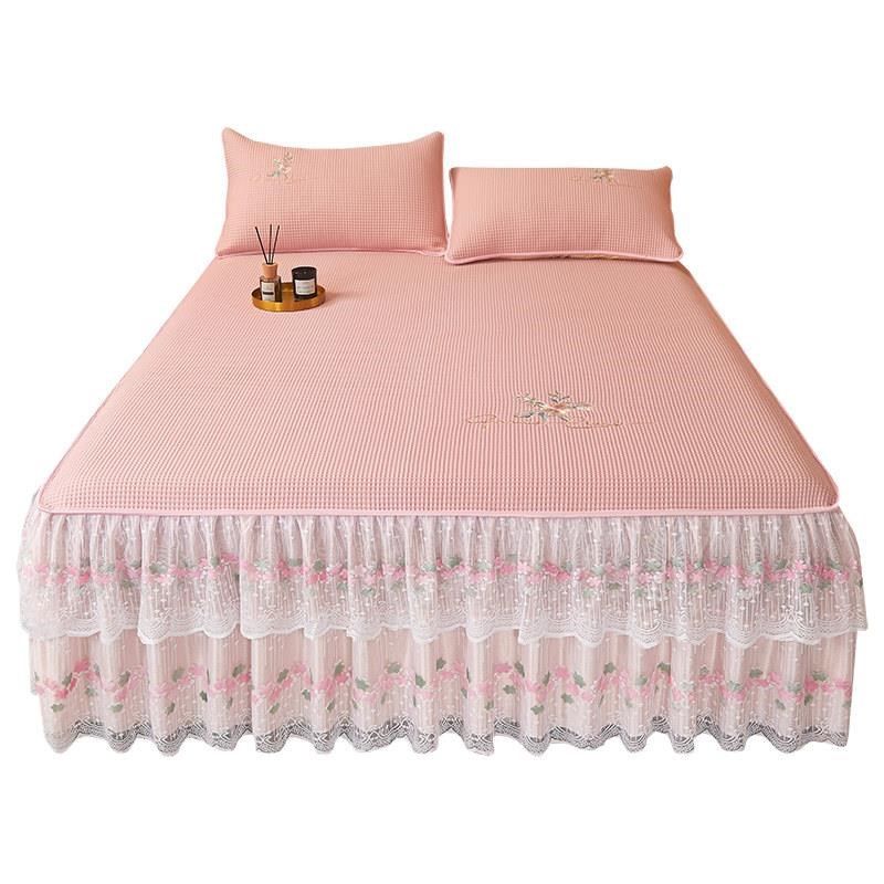 新款夏季床裙款冰丝凉席三件套粉色蕾丝花边床罩夏天空调软席子可