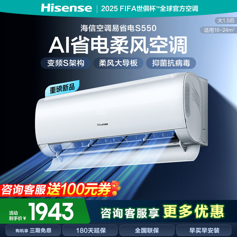 海信(Hisense)空调 大1.5匹 易省电S550 询单有惊喜 AI省电 自然风大风量不直吹 新一级能效 空调挂机 抑菌柔风 易省电 大1.5匹 【以旧换新补贴】35S550白