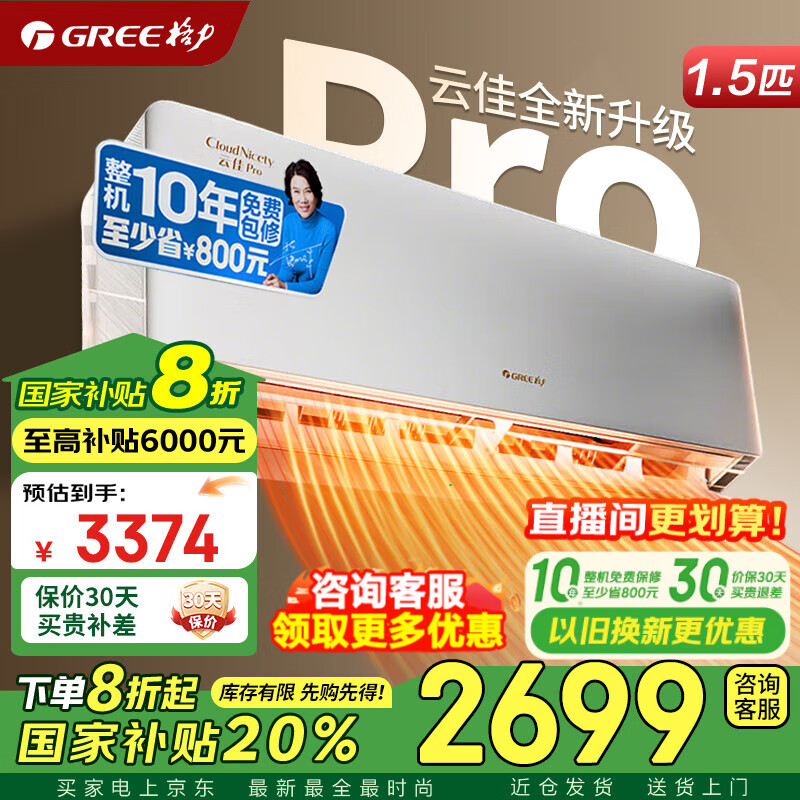 格力空调 1.5匹 云佳pro 新一级能效 变频冷暖 省电 空调挂机 京东官方正品 以旧换新 家电国家补贴8折 大1匹一级能效【云佳pro】新品上市