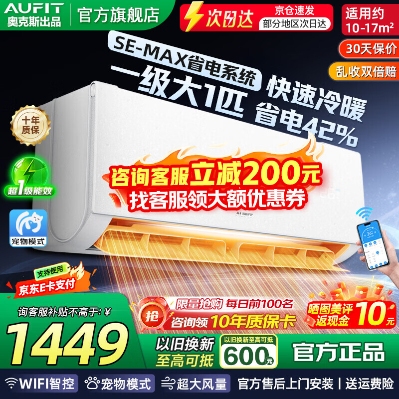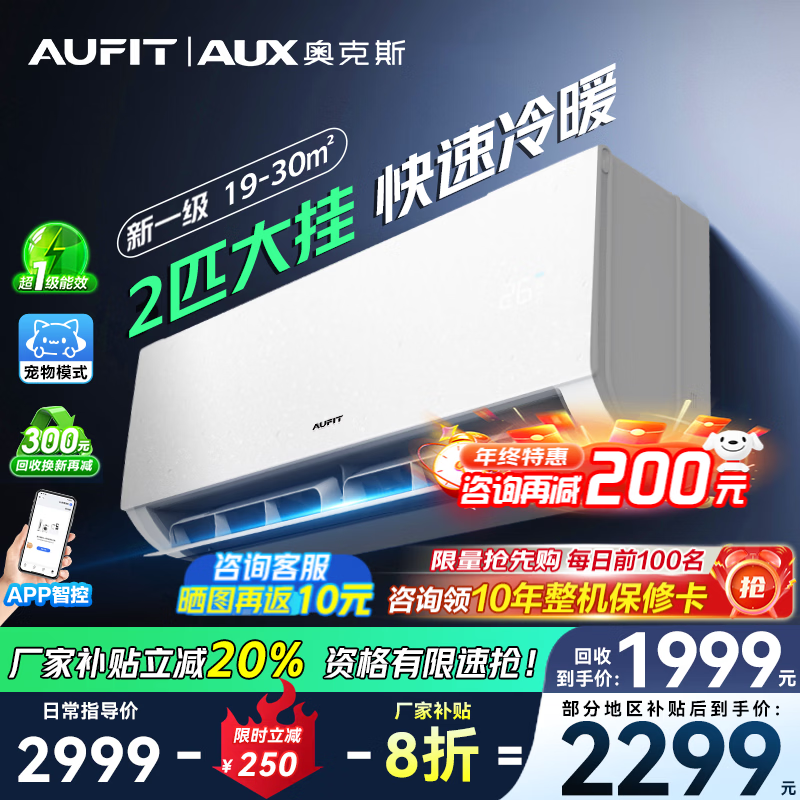 AUFIT空调奥克斯(AUX)出品 大3匹2匹1.5匹1匹新一级变频冷暖挂机立式柜机 国家补贴20% 自清洁除菌空调 大1匹 一级能效 wifi智控省电除菌宠物模式