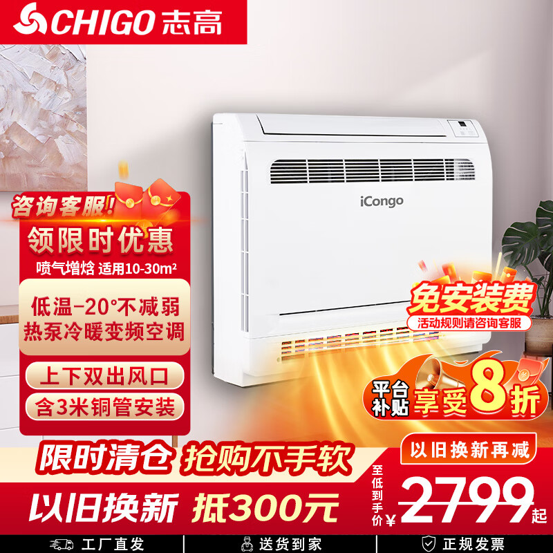 志高(CHIGO)热风机空调大1.5/小2p一级变频冷暖空调喷气增焓低温快速供暖泵增焓家用热风壁挂机膨胀阀 小2匹 一级变频冷暖 增气喷焓 包基础安装含室外机
