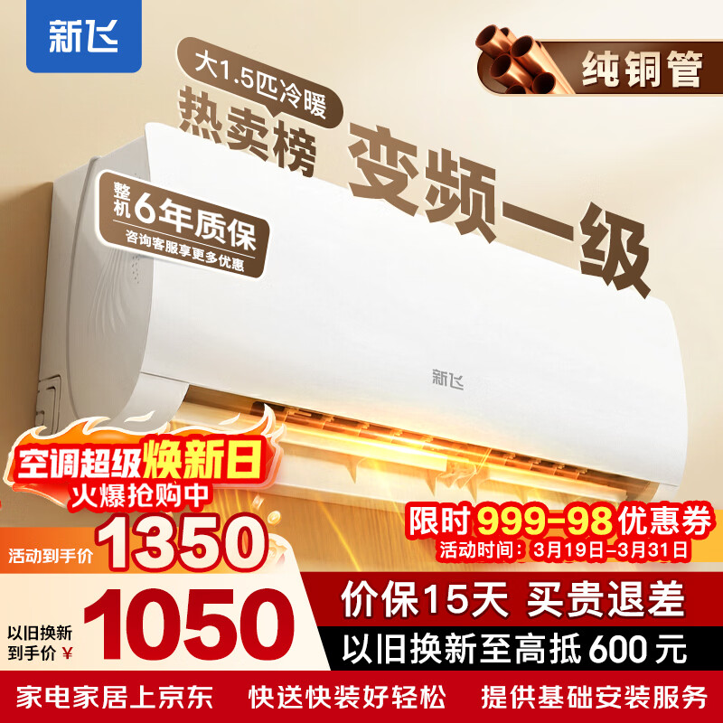 新飞(Frestec)空调补贴 新一级能效 大1.5匹 以旧换新 省电冷暖变频空调 家用壁挂式空调 冷暖 变频 大1.5匹 一级能效 提供上门安装服务