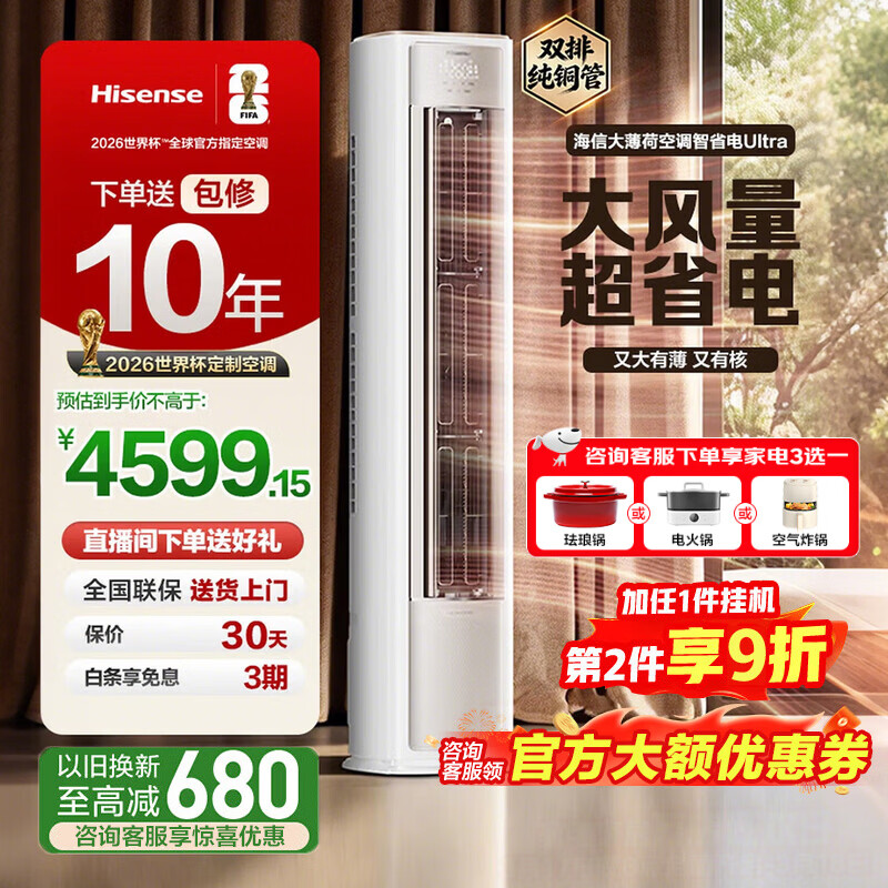 海信(Hisense)大薄荷空调 智省电Ultra大3匹 AI省电 速冷热超大风量 新一级能效 立式空调柜机 国家补贴 大3匹一级能效72LW/E370Pro-X1