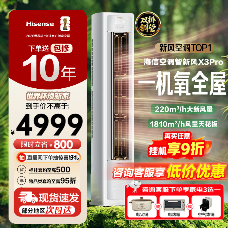 海信新风空调X3Pro 大3匹 增氧新风 AI省电大新风量一级能效 以旧换新 立式空调柜机 新风 一级能效 大3匹 72LW/X300Pro-X1