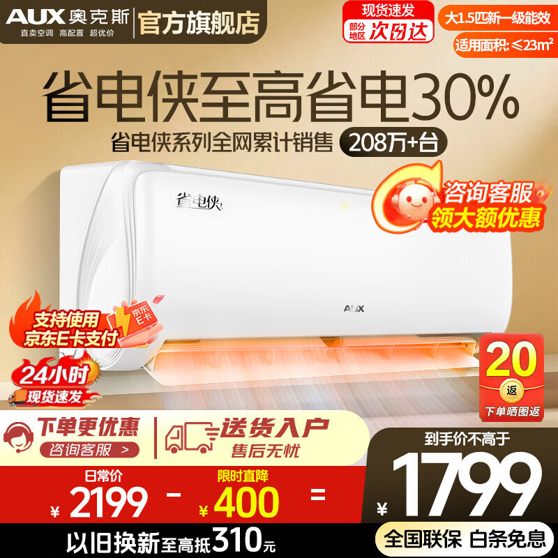 奥克斯(AUX)空调1.5匹 挂机新1级能效独立除湿节能省电一键舒风壁挂式卧室冷暖自清洁以旧换新 省电侠 大1.5匹 新一级能效省电3%