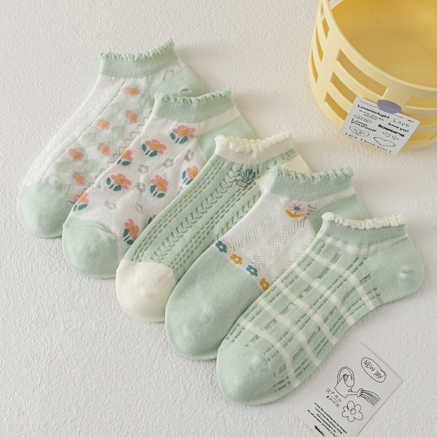 日本品质5双装空调袜子女春夏日系船袜小清新学院风女袜牛油果绿