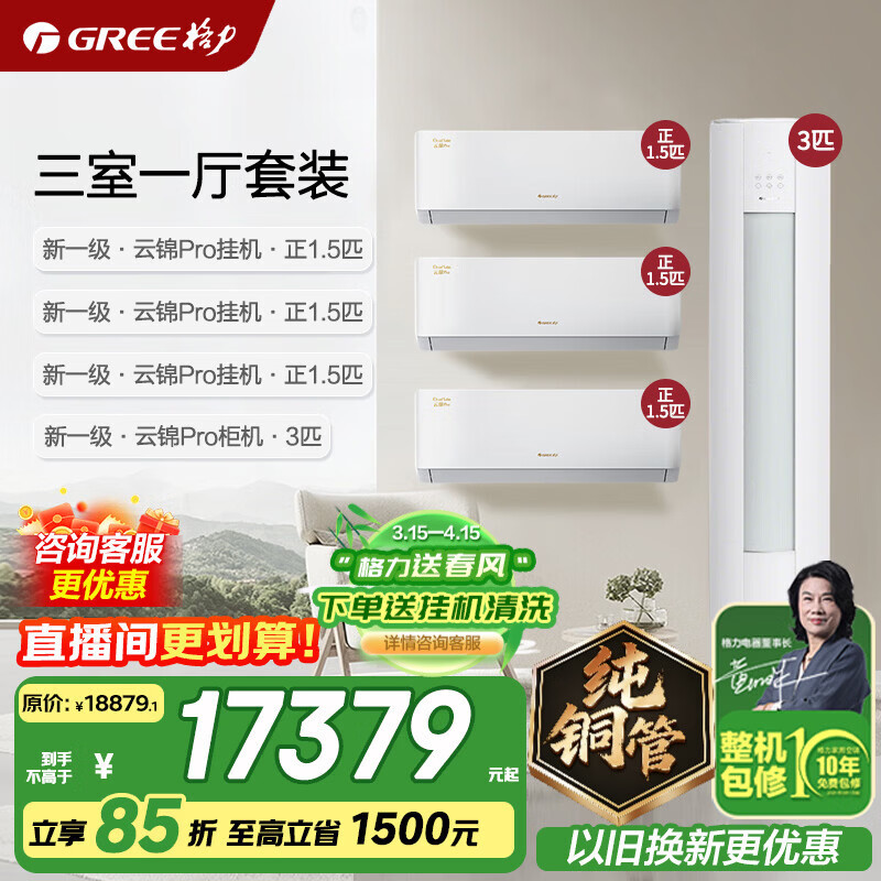 格力空调套装 云锦pro 云锦三代升级款 新一级能效 变频冷暖 立式柜机 柜挂组合空调套装 家电焕新补贴 【三室一厅】云锦Pro 1.5匹*3+3匹*1